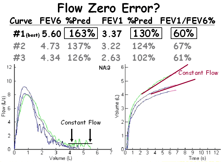 Although the above criteria may occur without a flow-zero error, to see all three conditions in the same test is highly suggestive of a flow zero error. Zero Errors can occur due to faulty electronic zeroing of the pressure transducer, resulting in either a false steady increase in flow or a false steady decrease in flow much like a leak. Although it is dependent on the type of flow-spirometer, usually the faulty zeroing occurs when the sensor is moved or air is allowed to flow through the sensor while a zero is being determined.