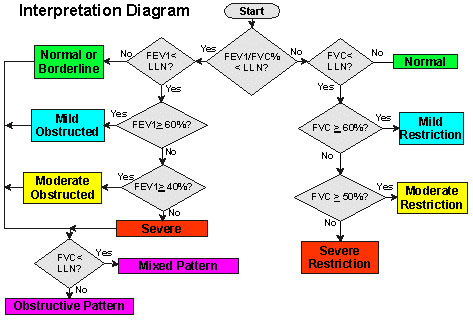 The interpretation of spirometry results can be done using the above algorithm. First, begin by determining if there is an obstructive lung defect by comparing the actual FEV1/FVC % to the lower limit of normal (LLN) for that value. If the FEV1/FVC % is less than the LLN, then there is the presence of obstruction. To determine the severity of obstruction, examine the left side of the algorithm to determine the FEV1 % of predicted and whether the obstruction is mild (value of FEV1 % is < LLN but > 60% of predicted), moderate (FEV1% is < 59% of predicted but > 41% of predicted), or severe (FEV1% < 40% of predicted). If the FEV1/FVC % is < LLN but the FEV1% is > LLN, this could be a normal variant or considered to be borderline obstructed. Then, to determine if there might be a restrictive lung defect, compare the actual FVC to its LLN. If the FVC < LLN, then there is the suggestion of a restrictive lung defect. The severity of restriction is determined by examining the right side of the algorithm as noted: mild restriction if FVC is < LLN but > 60% of predicted; moderate restriction if FVC is < 59% of predicted but > 51% of predicted; and severe restriction if the FVC is < 50% of predicted. Spirometry can only suggest the presence of a restrictive lung defect; it would require measurement of lung volumes to confirm the diagnosis of a restrictive lung defect.